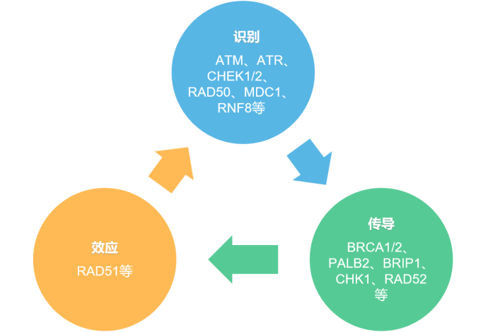 HRR是一个涉及多个步骤和基因的复杂信号通路。在DNA受损时,ATM等识别蛋白会先识别双链断裂的信息,并通过BRCA1/2等传导蛋白介导损伤信号传递,最后效应蛋白RAD51加载到DNA单链,促进单链的侵入和霍利迪连接体的形成,完成修复性合成,最终完成断裂的DNA双链的修复。